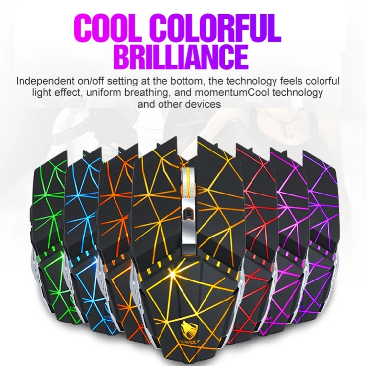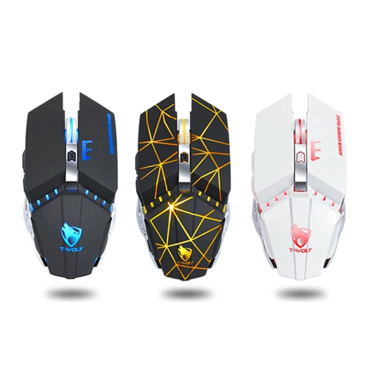T-WOLF Q15 6-Buttons 1600 DPI Wireless Rechargeable Mute Office Gaming Mouse with 7 Color Breathing Light