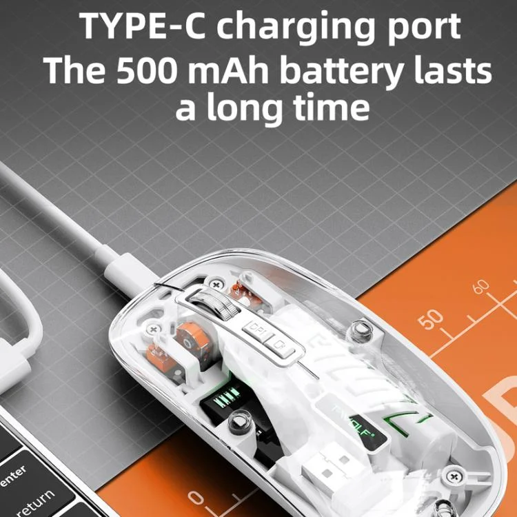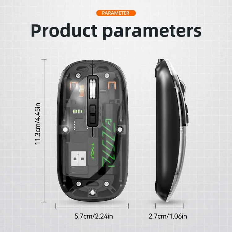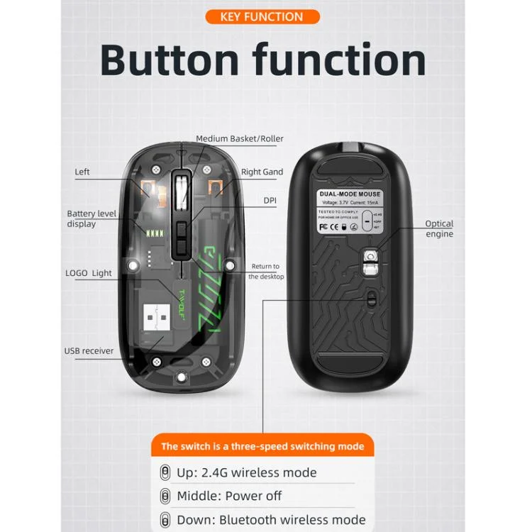 1. This transparent wireless dual-mode mouse combines avant-garde design with versatility, supporting both 2.4G and Bluetooth dual-mode connectivity for multi-system device compatibility.