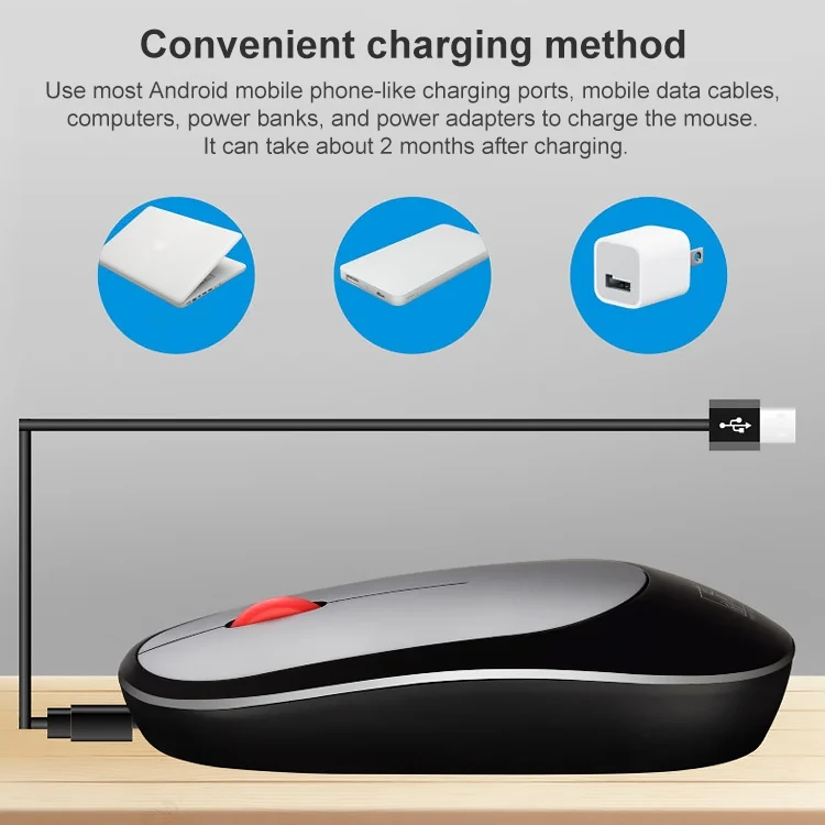 1. Using the same charging interface as most Android phones, the universal data cable for mobile phones, computers, power banks, and power adapters can all charge the mouse. It can take about 2 months to charge.