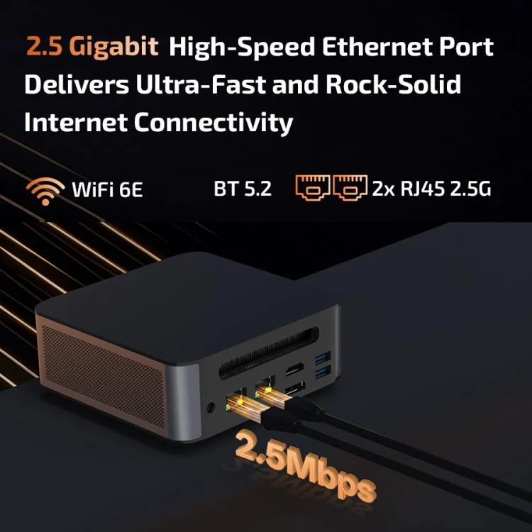 6. Interface: DC port x 1, USB3.0 x 3, USB2.0 x 1, RJ45 2.5G x 2, HDMI 8K x 1, DisplayPort x 1, Audio Jack (HP&MIC) x 1, Full Function Type-C x 1