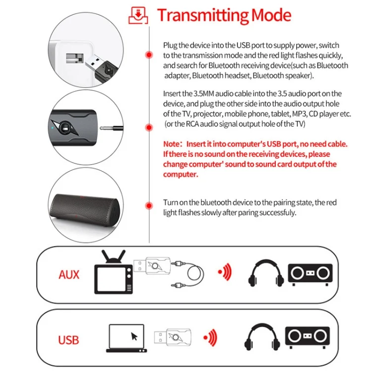 9. Features: receive/transmit mode button switch, convenient and fast, no driver, plug and play, with AUX output