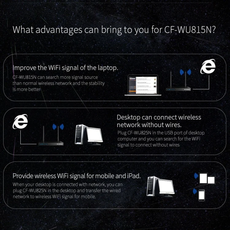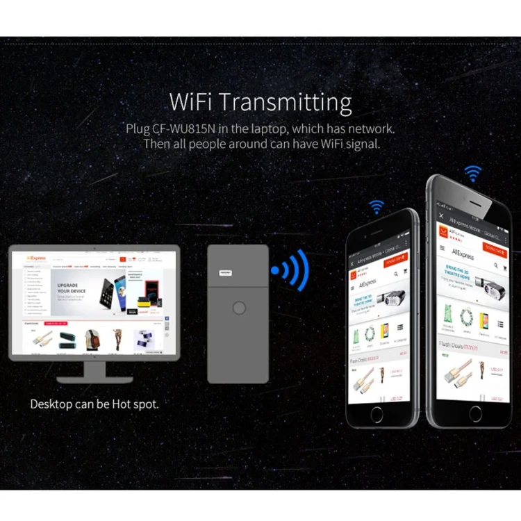 3. Plug CF-WU815N in the laptop, which has network, then all people around can have WiFi signal.