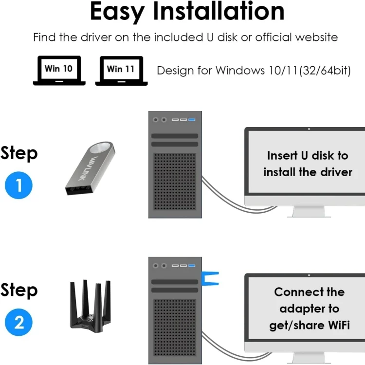 8.Support Windows 11/10: This WiFi adapter is only compatible with Windows 10/11 (32/64 bit) and is not suitable for computers using other operating systems (to ensure normal use, please install the driver according to the instructions provided in the quick start guide)