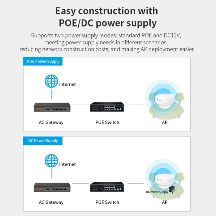 7. Power supply: 48V POE power supply (WAN), 12V DC power supply