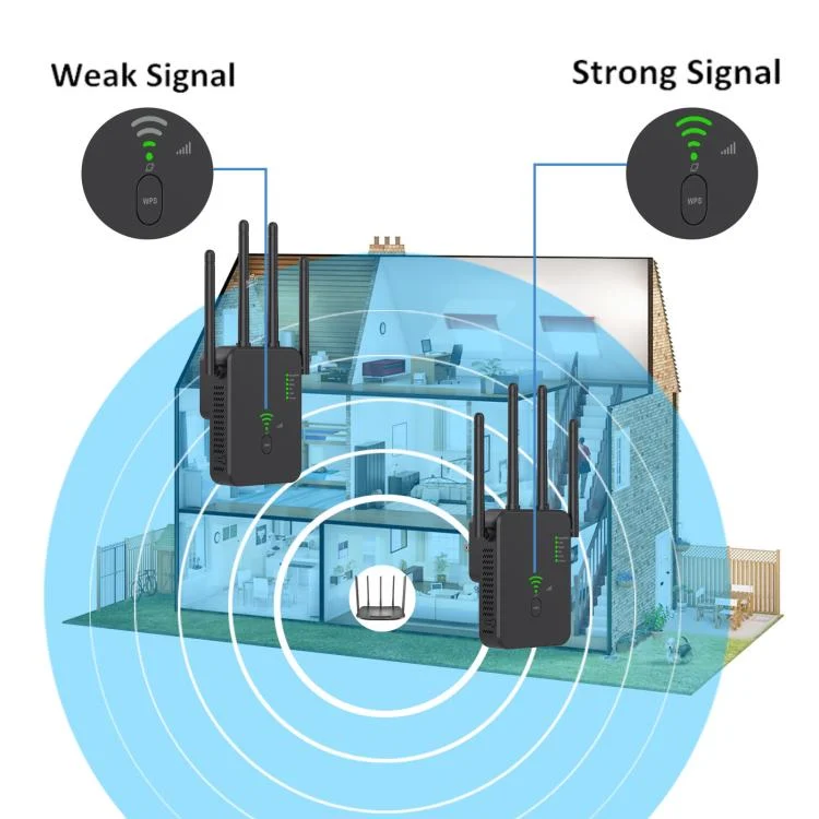 1. 1200M dual-band WiFi range extender adopts 802.11 ac technology to expand coverage, improve existing wireless networks signal strength, and eliminate dead spots. Simultaneous 1200 Mbps dual-band transmission rate, up to 5GHz 867Mbps + 2.4 GHz 300Mbps