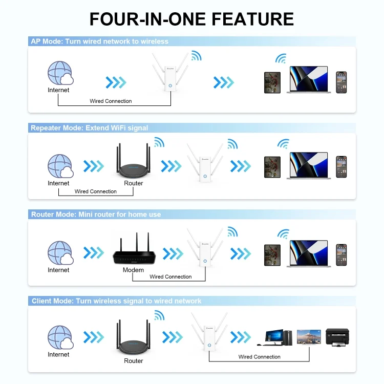 3. Flexible switch between three modes of wireless relay/AP/Easymesh agent