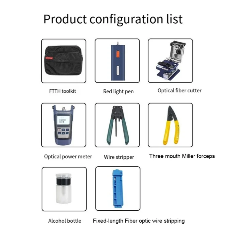Tool kit list: FTTH tool kit, red light pen, fiber cutter, optical power meter, wire stripper, three-mouth Miller pliers, alcohol bottle, length fixer