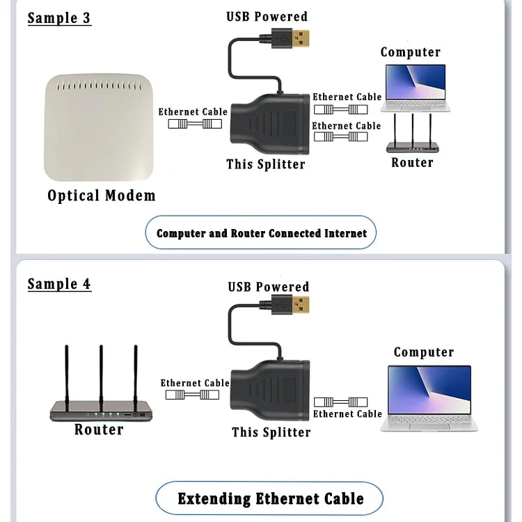 1. Solve the connection problems caused by insufficient cabling, using USB power supply, supporting two computers to share one Ethernet cable at the same time