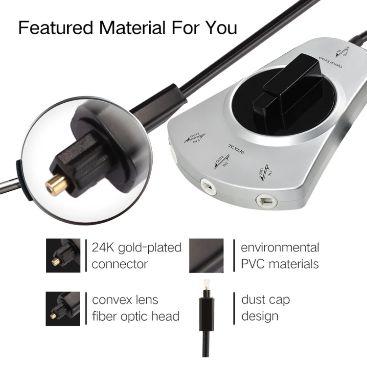 1. The hand-cut optical fiber switcher with 3 input and 1 output knobs can connect three playback devices with digital optical output to an audio amplifier with only a single input. Just turn the central knob to switch the device you want to play, eliminating the need for repeated insertion of cables pulling trouble