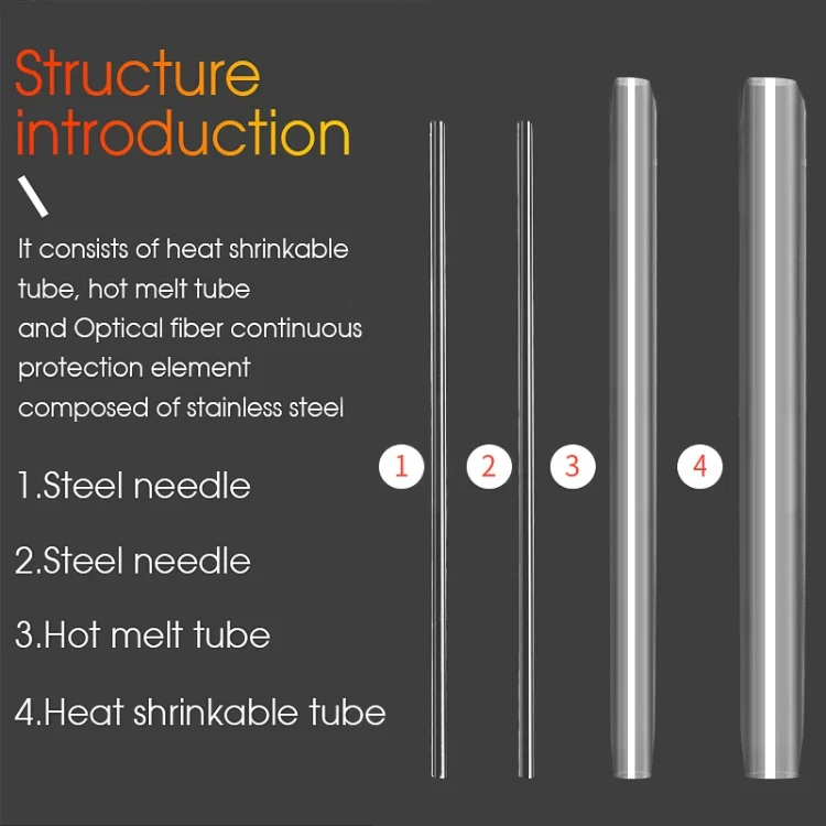 6. Structure: heat-shrinkable tube + heat-melt tube + stainless steel optical fiber continuous protection element