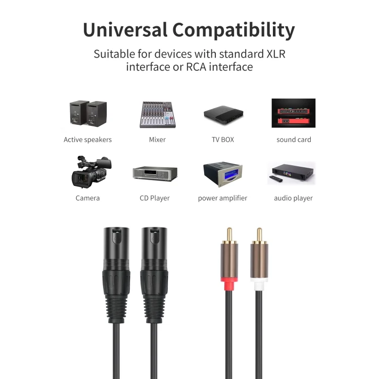 1. This cable can convert the unbalanced RCA output interface of the device to the XLR input interface, which is very suitable for interface conversion of mixers, audio players, audio decoders, power amplifiers, active speakers and other devices. For example, this cable can be used to convert the RCA interface of the audio player to the XLR MALE interface and connect it to the XLR input interface of the power amplifier.