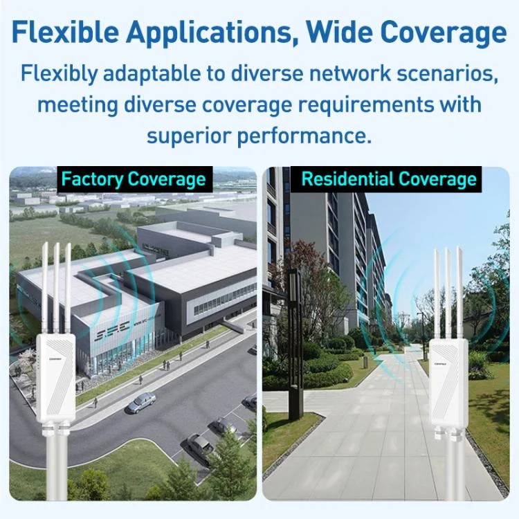 1. Wi-Fi 7 3600 Mbps high-power omnidirectional outdoor AP, with a coverage radius of 240-600 meters, supporting over 200 high-bandwidth devices, 66 2.4 GHz devices, and approximately 134 5.8 GHz devices.