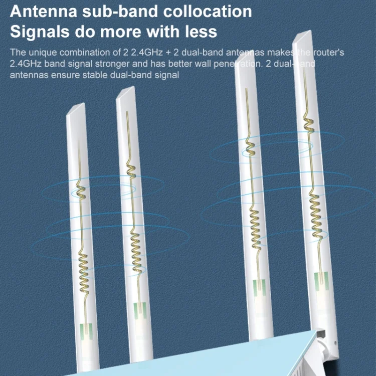 2. Wireless standard: two 2.4GHz, 5dBi antennas, two dual-band omnidirectional 5dBi antennas