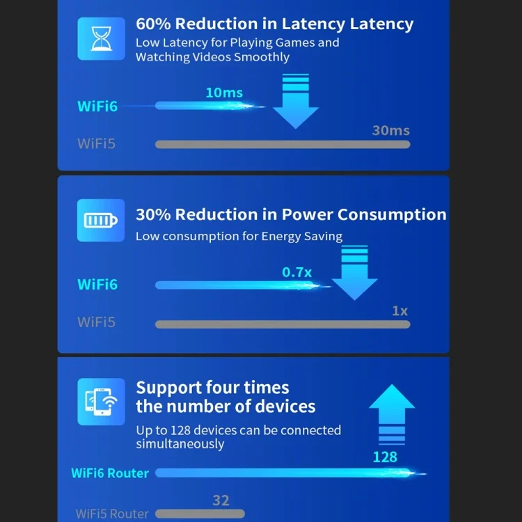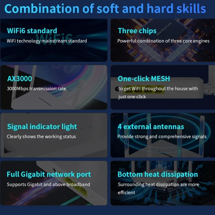 1. Wireless rate up to 3000Mbps, support 2.4G/5.8hHz dual-band, giving users a stable, reliable, and non-disconnected Internet experience