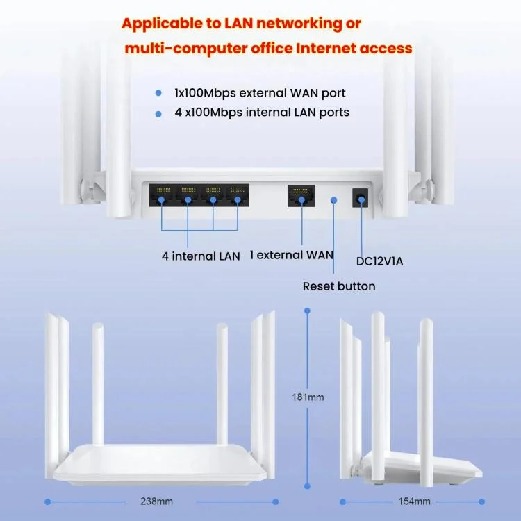 4. 1 100Mbps WAN port and 4 x 100Mbps LAN port, suitable for LAN networking or multi-computer office Internet access