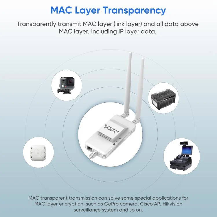 14. Support IP layer transparent transmission and MAC layer transparent transmission two bridge modes to meet various bridge applications; IP layer transparent transmission (factory default), transparent transmission of IP layer data, can meet most bridges Application; MAC layer transparent transmission, transparent transmission of all data above the MAC layer (link layer) and MAC layer, including IP layer data. MAC transparent transmission can solve some special applications for MAC layer encryption, such as GoPro camera, Cisco AP, Hikvision monitoring system.