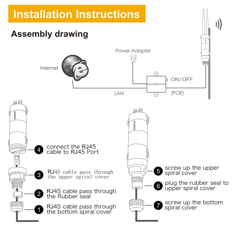 5. Moisture-proof RJ45 connector, integrated passive power over Ethernet (PoE)
