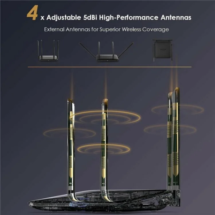 4.Wide Coverage:Four 5dBi high-gain antennas provide omnidirectional signal reception, covering 1076-1507 square feet and connecting up to 128 devices simultaneously.