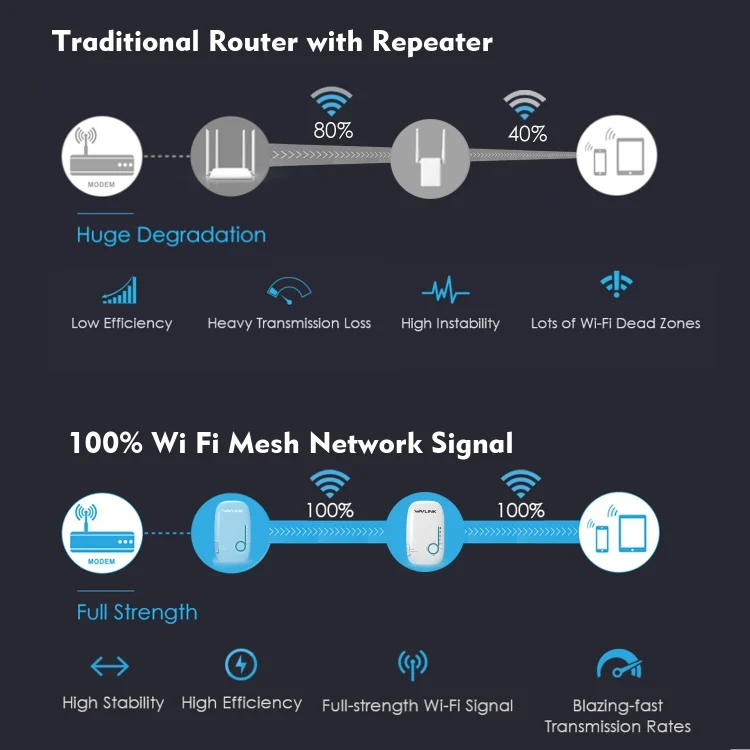 4.WAVLINK WiFi system uses a new type of WiFi technology – Mesh network system, multiple WAVLINK Wi-Fi points work together to create an always strong and fast Wi-Fi network. Even better, this Wi-Fi system intelligently connects you seamlessly to the best Wi-Fi available, eliminating the need to manually switch routers and range extenders as you move around your home