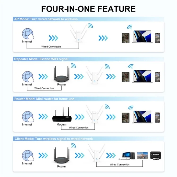 3.EXCELLENT AND POWERFUL SIGNAL: Wavlink WIFI range extender comes with four specially designed 5dBi high-gain antennas, providing longer signal extension coverage than ordinary 3dBi on the market, covering every corner of your home