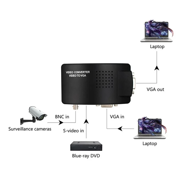 The product (BNC to VGA) is a non-destructive video converter designed for security and home users. It can convert video signals into VGA signals with various resolutions. From 800X600 to 1920X1200, it adopts advanced digital image processing technology and various VGA resolution outputs. In order to achieve back-end display, point-to-point display can be realized and quality pictures can be displayed.