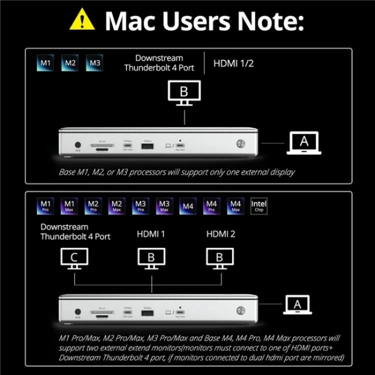 5. Due to hardware limitations, for MacBook is limited to 4K 60Hz in single/dual/triple display mode.