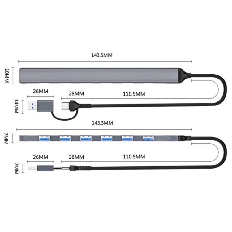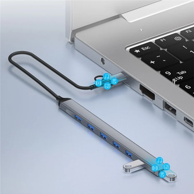 1. The hub offers a total of seven output ports, including one USB 3.0 port and six USB 2.0 ports. Ideal for connecting peripherals like keyboards, mice, flash drives, and more