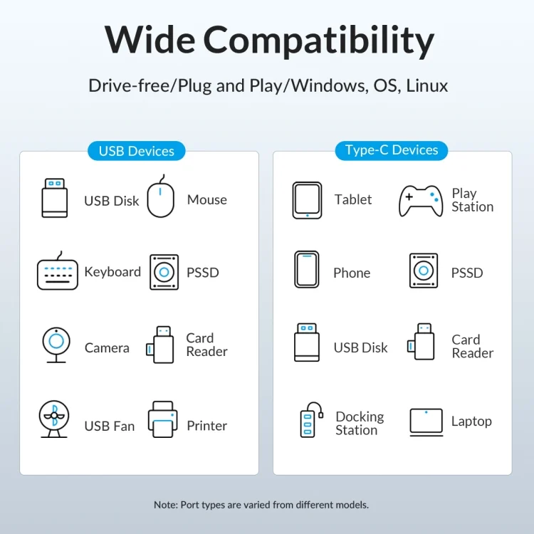 4. 5V 2A Power Supply Interface: ORICO USB 3.2 aluminum Hub reserved USB-C 5V power supply interface, can be external 5V 2A power supply sufficient to ensure the normal operation of high-power USB devices; (This product package does not include the power adapter) Support hot-plug, no driver.