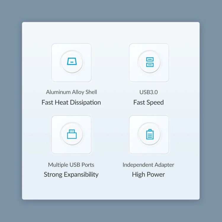 6. ORICO USB 3.2 Aluminum Hub reserved USB-C 5V power supply interface, can be external 5V 2A power supply sufficient to ensure the normal operation of high-power USB devices;(This product package does not include the power adapter) Support hot-plug, no driver.