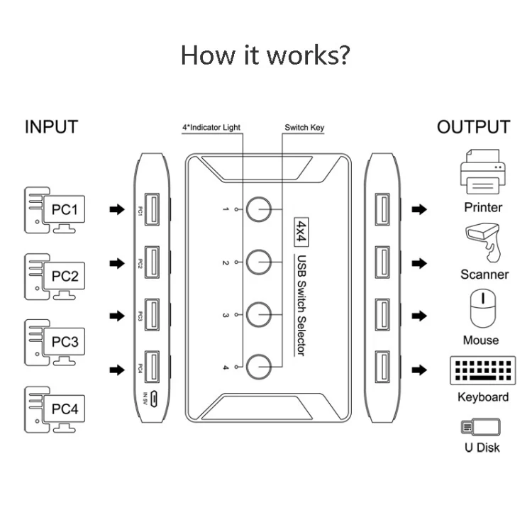 2. 4-port one-key switch, plug and play, 5Gbps