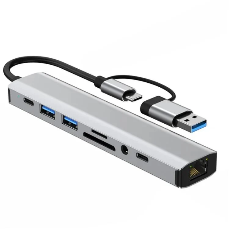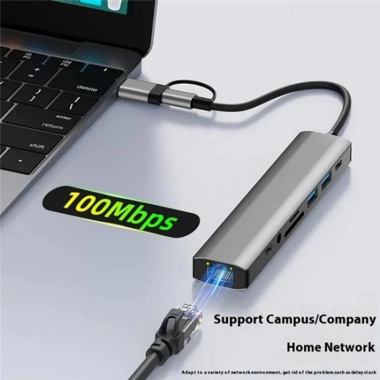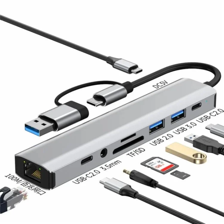 2509 RJ45, USB3.0, USB2.0, USB-C2.0, 3.5mm, DC5V, SD / TF Card Reader Adapter USB-C / USB Hub
