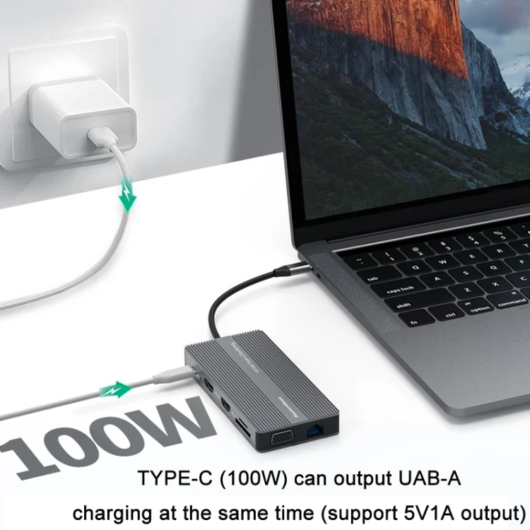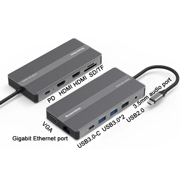 8. Function: HDMIx2 (4K/30Hz); VGAx1 (1080P/60Hz); Gigabit Ethernet port x1 (1000Mbps); PD 3.0×1 (100W); TYPE-C3.0x1 (5Gbps); USB3.0x2 (5Gbps); USB2.0x1 (480Mbps); 3.5mm audio x1 (supports voice/audio); SD+TF card slot 2.0