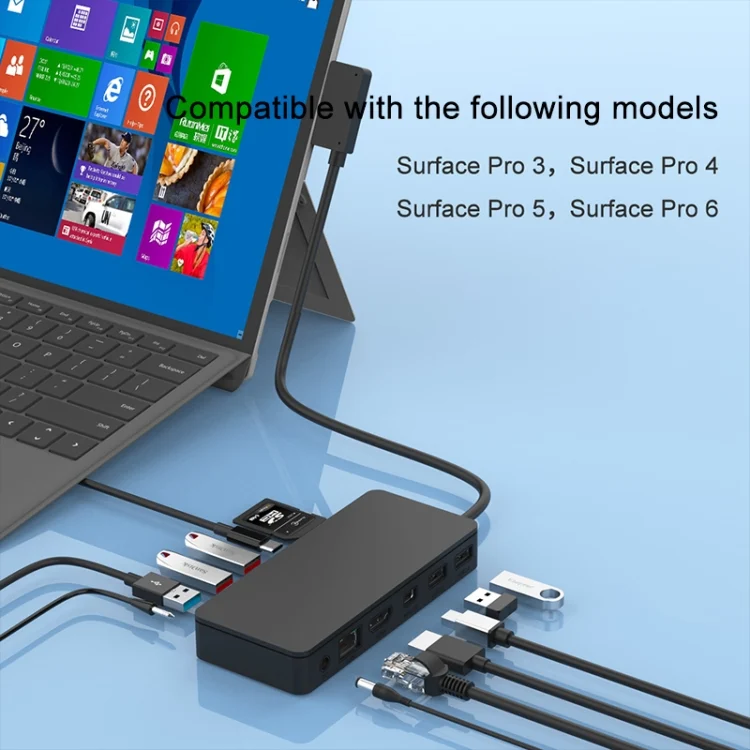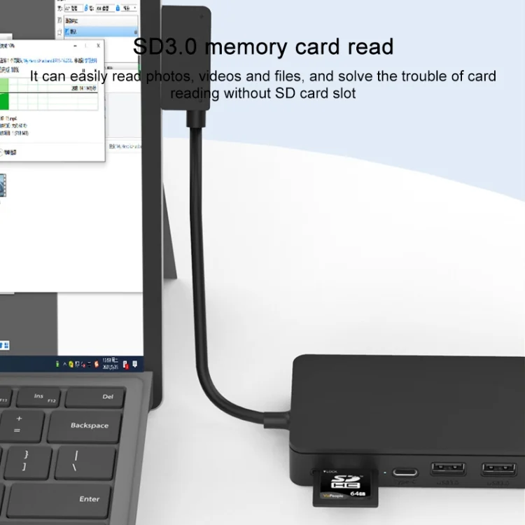 6. Interface: RJ45/Mini DP/HDMI/USB3.0/USB2.0/SD3.0/3.5 Audio/Type-C/QC3.0/DC5.5 (power supply)