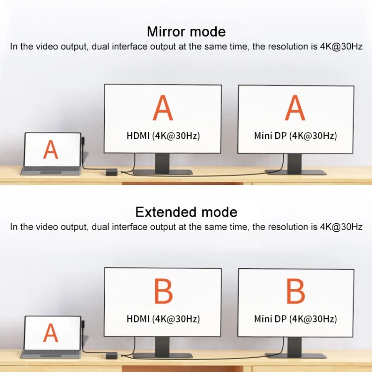 3. Mirror mode, when the video is output, the dual interface outputs at the same time, the resolution is 4K@30Hz
