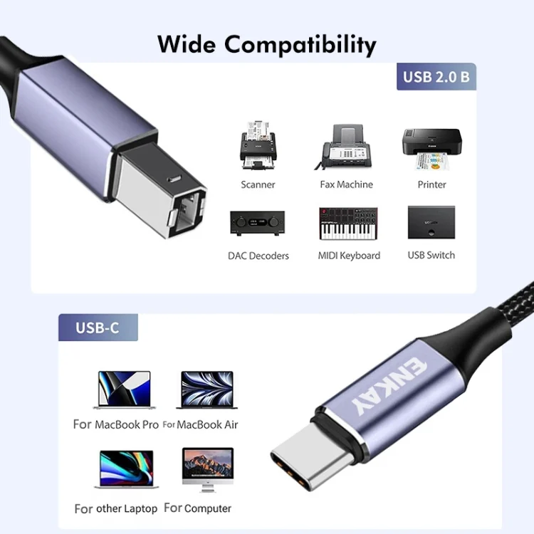 ENKAY ENK-CB170 USB C / Type-C to USB 2.0 B Printer Scanner Nylon Braided Cable