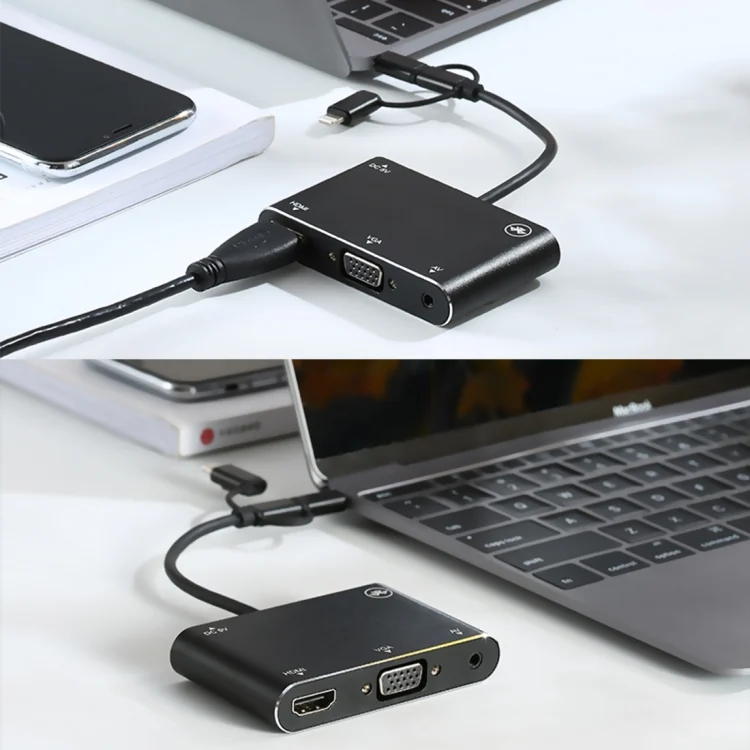 3 in 1 8 Pin + Micro USB + Type-C to AV + HDMI + VGA 15 Pin HD Screen Player Adapter Converter with Audio