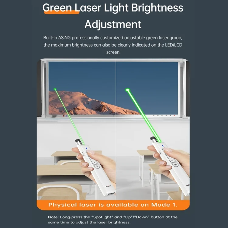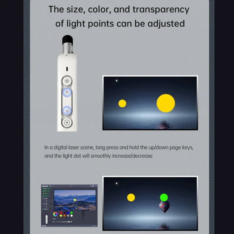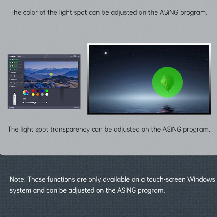 5. The green laser brightness is adjustable, and the touch-screen digital laser color/size/light spot transparency is adjustable (needs to be used on a touch-screen Windows system and can be adjusted on the ASiNG special program)