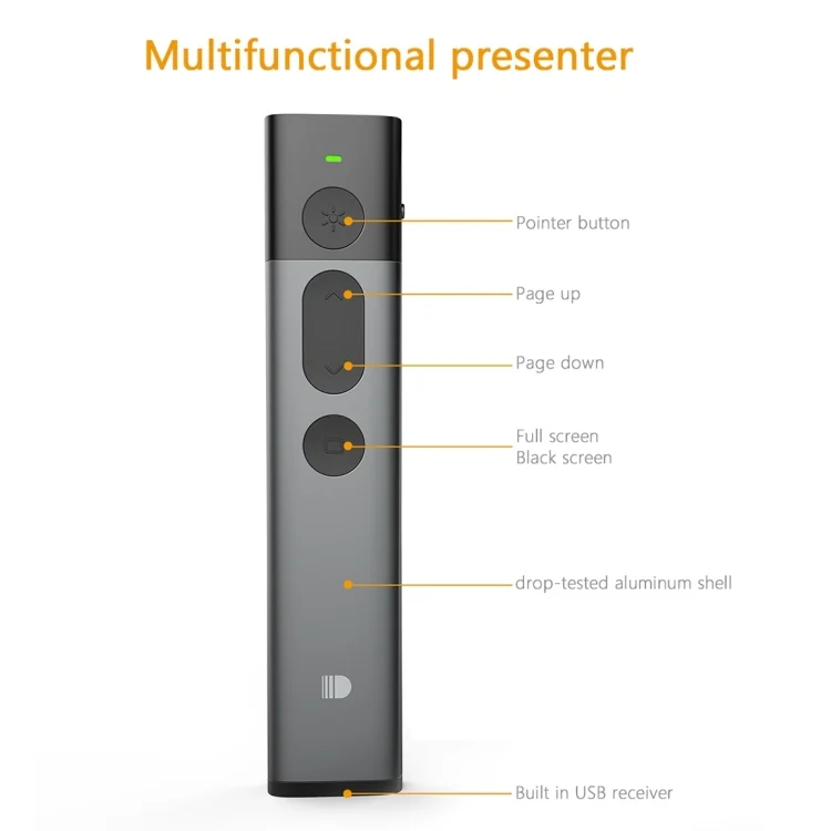 4. Wireless presenter, it is equipped with top-grade microchip, up to 100 meters wireless range. Operating on 2.4G RF frequency, it is an ISM free frequency and can be used world-wide.
