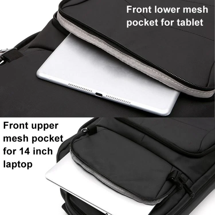 1. Front lower mesh pocket for tablet, front upper mesh pocket for 14 inch laptop, back zipper mesh for 15 inch laptop