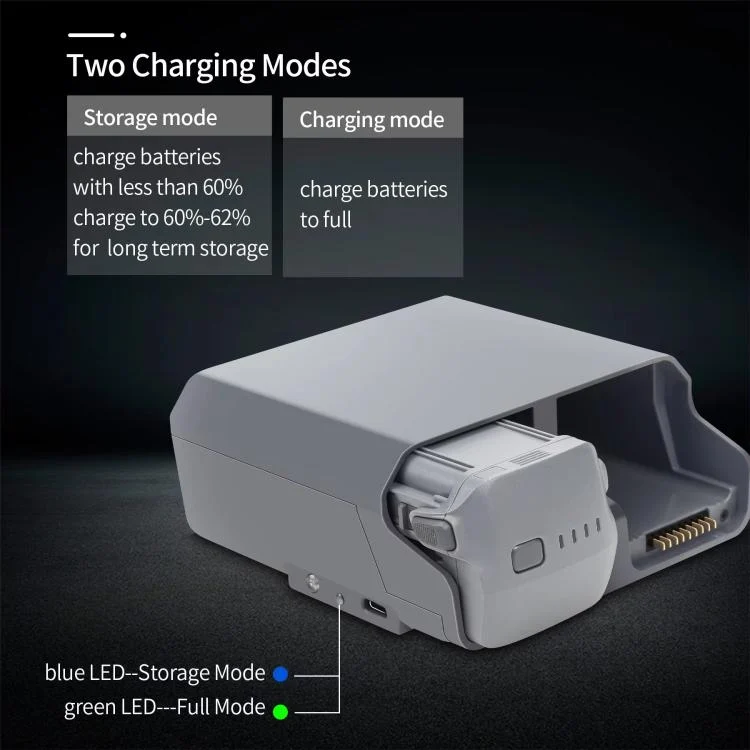 2. Two modes: Charging mode quickly charges the battery; Storage mode charges the battery with a battery level below 60% to about 60% for long-term storage, reducing battery attenuation and swelling caused by the drone battery being empty or fully charged