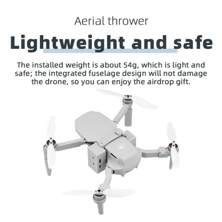 4. The installed weight is about 54g, light and safe; the integrated fuselage design will not increase the burden on the drone, nor will it damage the drone, so you can enjoy airdropping gifts;