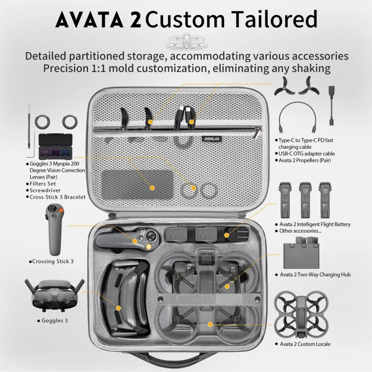 1. Specially designed for DJI Avata 2, and can also store Avata 2 aircraft and accessories.