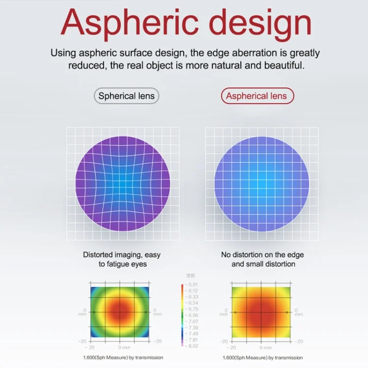 4. Aspherical resin lens: Thinner and more translucent than spherical lens, the vision is lifelike, and the visual effect is more comfortable.