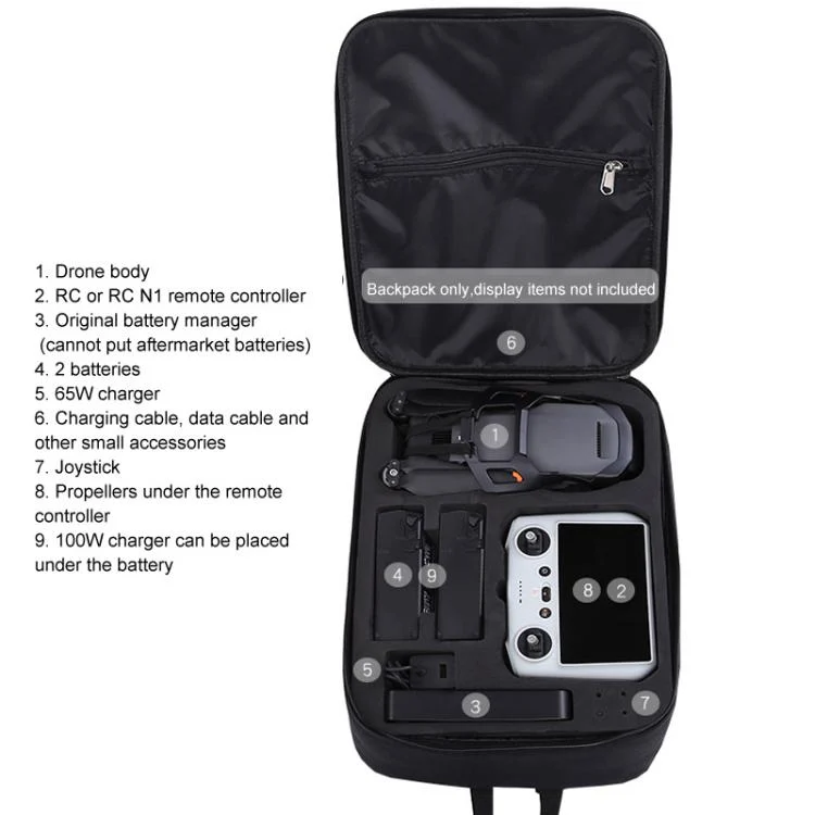 4. Capacity: can store the fuselage, RC or RC N1 remote control, original battery butler (not compatible with aftermarket), 2 batteries, 65W/100W charger, propellers, data cable, etc.