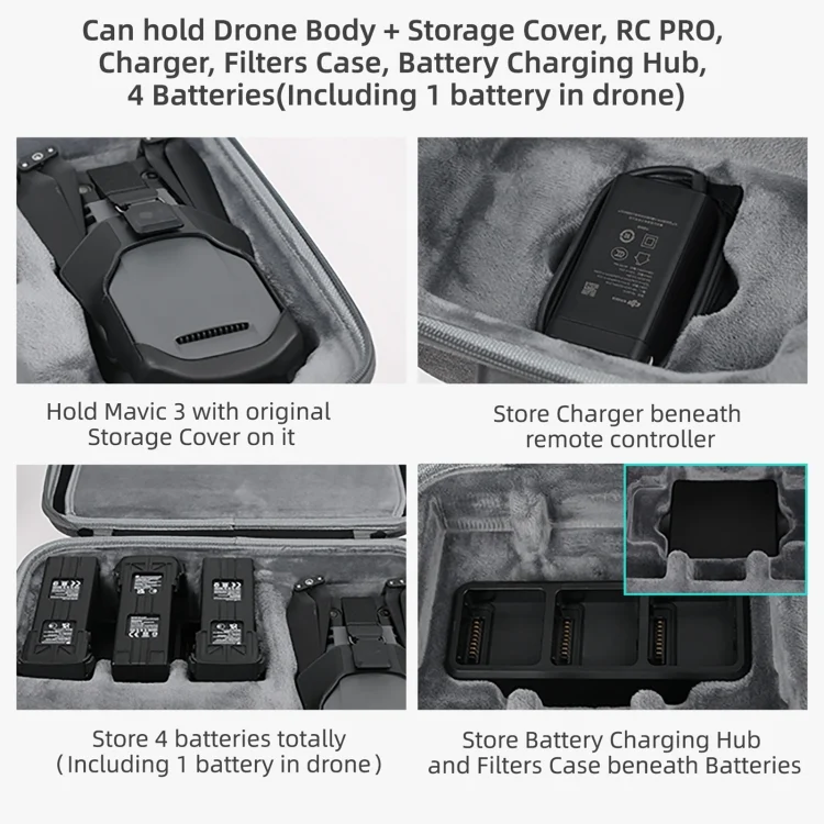 2. The bottom cover can store the body + protective cover, remote control, charger, filter set, charging butler, 4 batteries, etc.