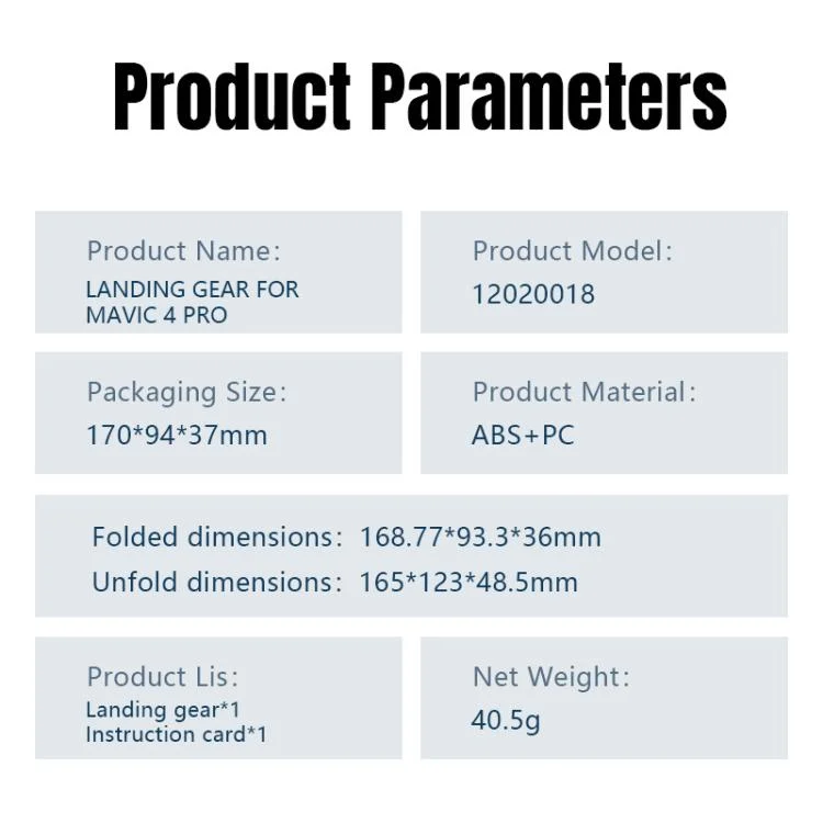 3. Durable & Lightweight: Made from high-strength plastic, the entire landing gear weighs only 40g. Its lightweight design does not burden the drones flight performance while maintaining strong load-bearing support.