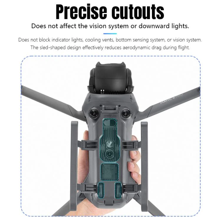 1. Specifically Designed for DJI Mavic 4 Pro: This foldable landing gear is tailor-made for Mavic 4 Pro. It does not block the aircrafta??s indicator lights, cooling vents, bottom sensors, or visual system. The sled-style shape helps reduce aerodynamic drag during flight, providing greater stability during takeoff and landing.