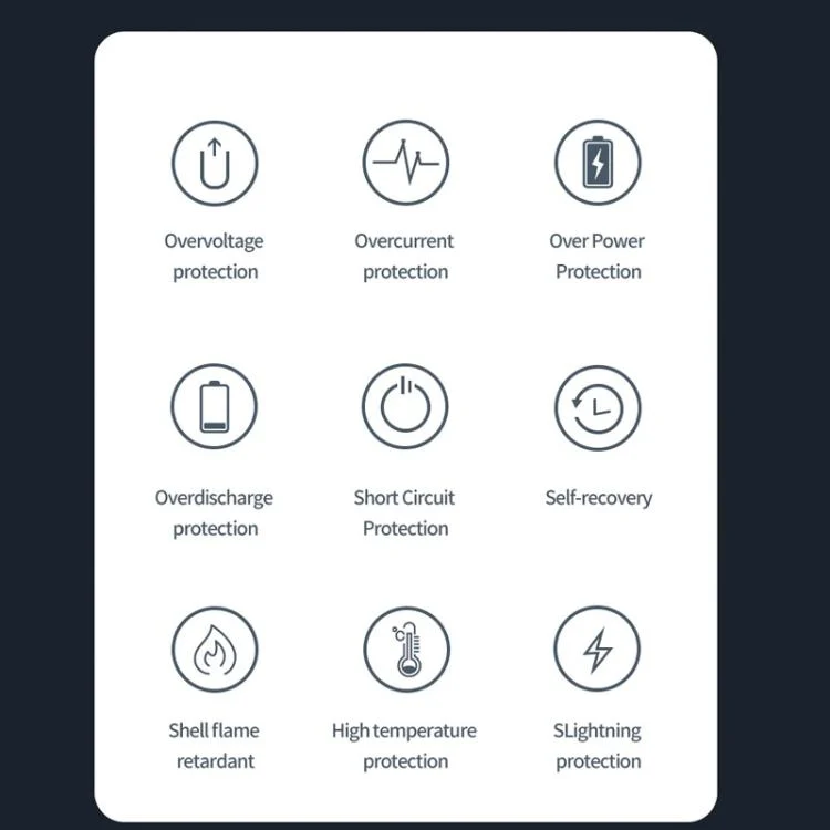 3. Advanced Safety Protection: Built-in 9-layer safety system: Over-voltage, over-current, over-power, over-discharge, short-circuit, over-temperature, surge (lightning strike), flame-retardant casing, and recovery protection.
