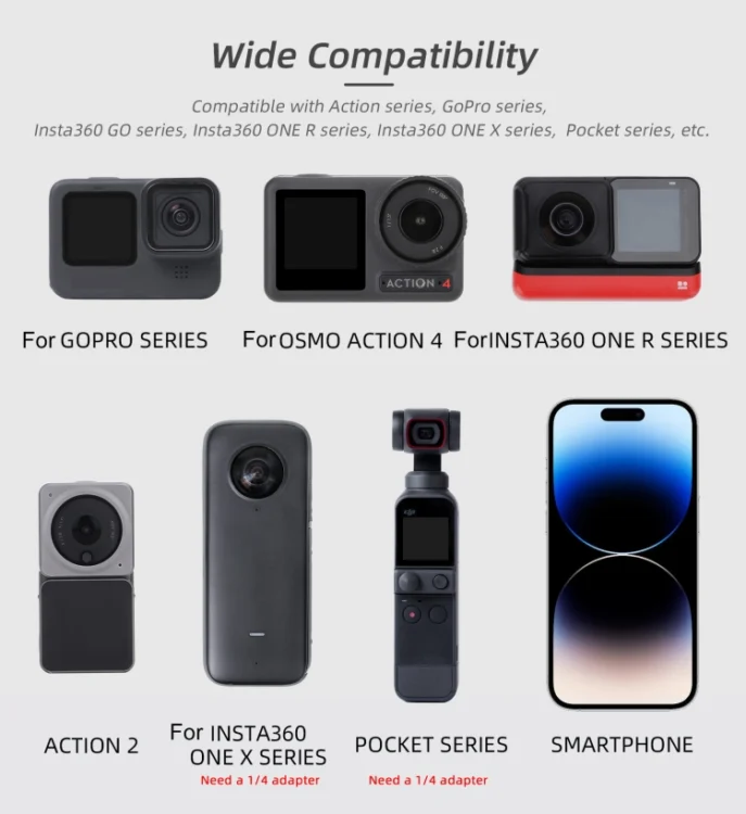 6. Widely compatible and can be used with a variety of action cameras, suitable for GoPro series, Insta360 GO series, Action series, Insta360 ONE R series, Insta360 ONE X series, Pocket series, etc…