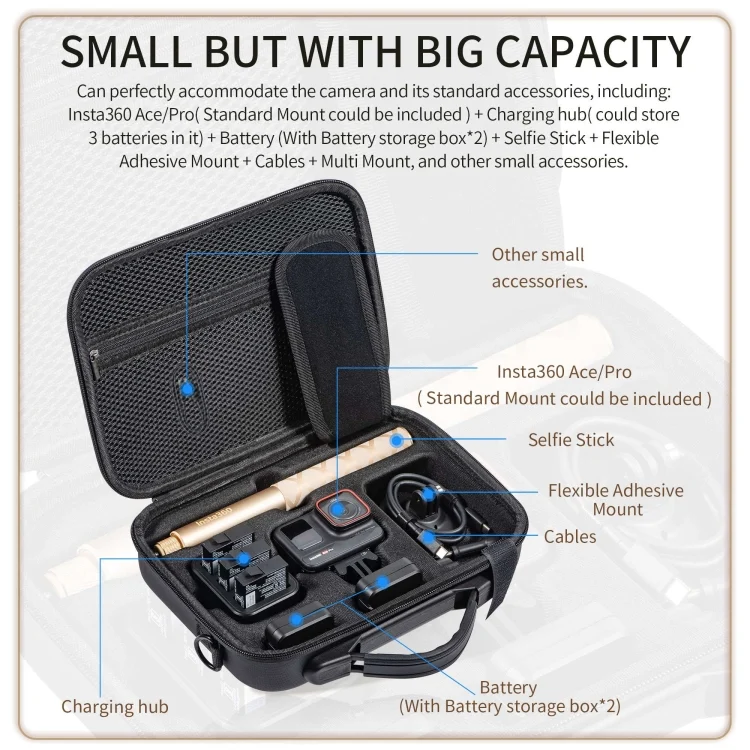 1. Specifically designed for Insta360 Ace / Ace Pro action camera, precise mold opening, small size but large capacity, can perfectly store the camera + regular accessories, such as storage: camera (with quick release base) + charging butler + battery (with battery storage Box)*2+selfie stick+flexible adhesive base+data cable+locking screw and other small accessories;